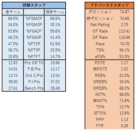 第1戦で下振れた3P%(18.2%)が、この試合は34.5%にまで修正され、eFG%も41.5%→55.9%と上昇し、一定のアジャストは見せました。