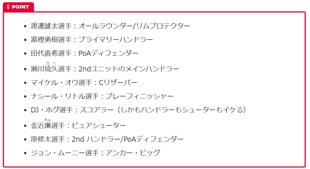 既出記事でも言及していますが、今シーズンはロスターの整理に成功し、各選手の役割が明確且つオーバーラップが無くなりました。