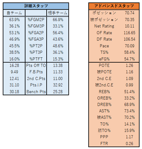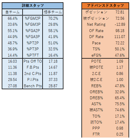 64得点は今シーズン最少得点という試合でした。この試合はNet Rating(OF Rate-DF Rate)が-5.47。仮に1点差で勝利していても、Net Ratingがマイナスとなる可能性があったほどOFの効率が悪い試合でした。