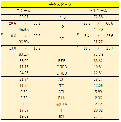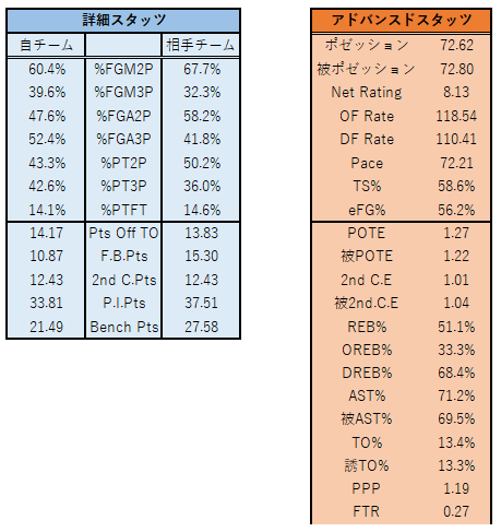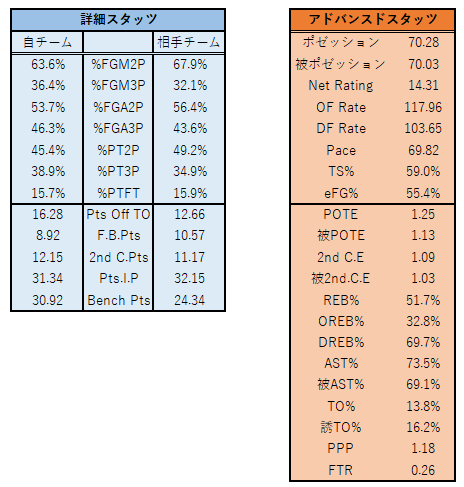 OFの効率面で言えば、OF Rate:120を超えているものの、2PFG%が50%を下回り(19/39:48.7%)、FG%は40.6%(26/64)と本来なら負け試合の水準でした。