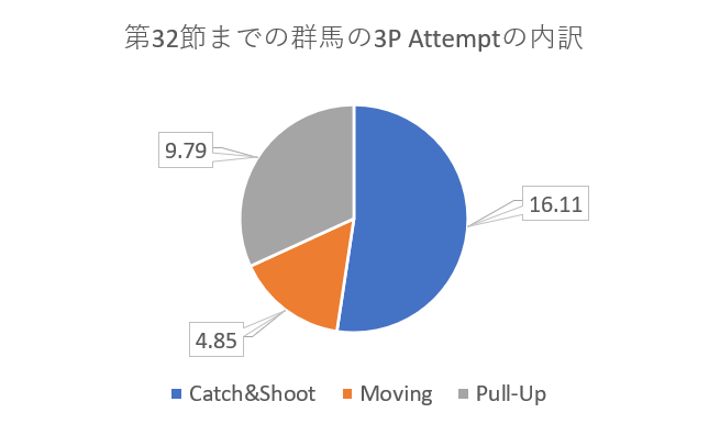 その理由はというと、3Pシュートの内訳。前節までの群馬の3P Attemptの内訳を見てみましょう。